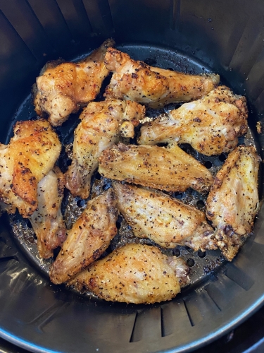 - Season the chicken wings with salt and pepper and put in the air fryer basket.