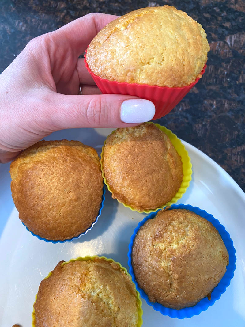 The recipe uses simple ingredients that you likely already have on hand. And all you have to do is mix the Jiffy corn muffin mix together as stated on the box, pour the batter into some silicone muffin cups, put the muffins in the air fryer, and then bake until perfectly golden brown! They come out hot and ready to be spread with some butter or honey.