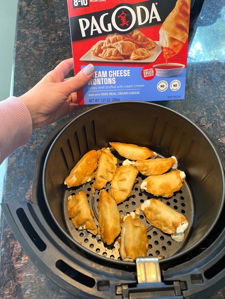 All you need is your air fryer and a package of frozen cream cheese wontons. You can use any brand, I just happened to find the Pagoda brand and decided to give it a try!