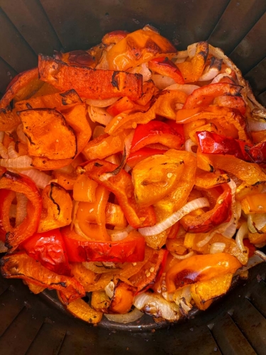 Add peppers to air fryer basket and cook at 400 degrees for 13 minutes. At about the 6 minute mark, remove the basket from the air fryer and shake peppers to redistribute them. Replace the basket in the air fryer and continue cooking.