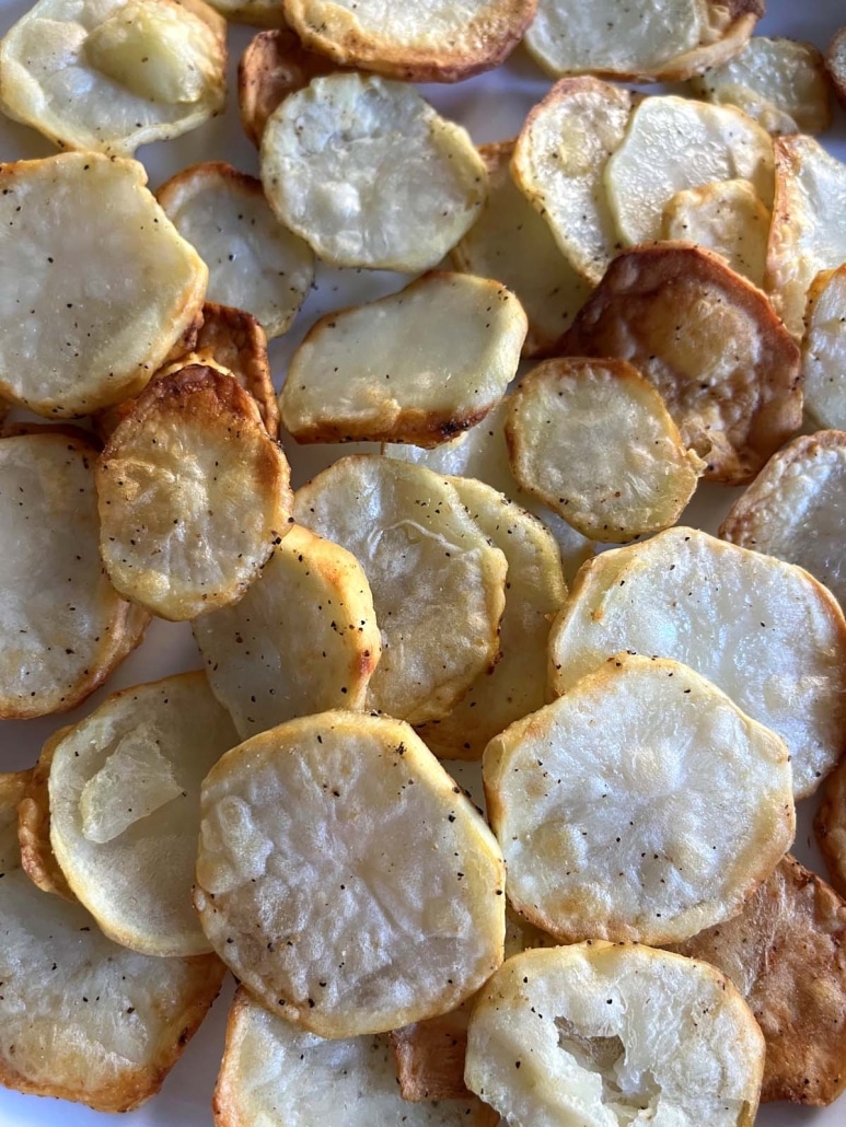 These lightly seasoned potato slices compliment so many dishes. We love them especially with steak dinners like Air Fryer New York Strip Steak, Air Fryer T-Bone Steak, or Air Fryer Filet Mignon Steak.