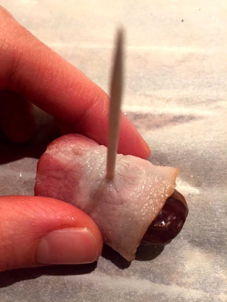 Step 3: Wrap dates with bacon and secure with toothpicks.