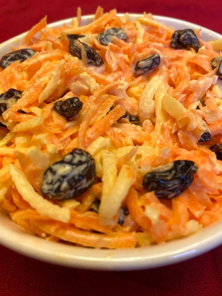 Carrot raisin salad is a true old-fashioned recipe, it’s been around for at least 50 years. A classic American version uses canned pineapple chunks, but my version uses a fresh apple.