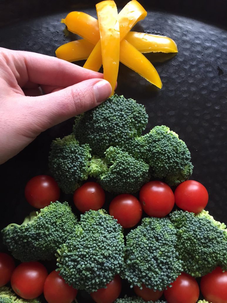 - Add the final line of broccoli to make the bottom of the Christmas tree.