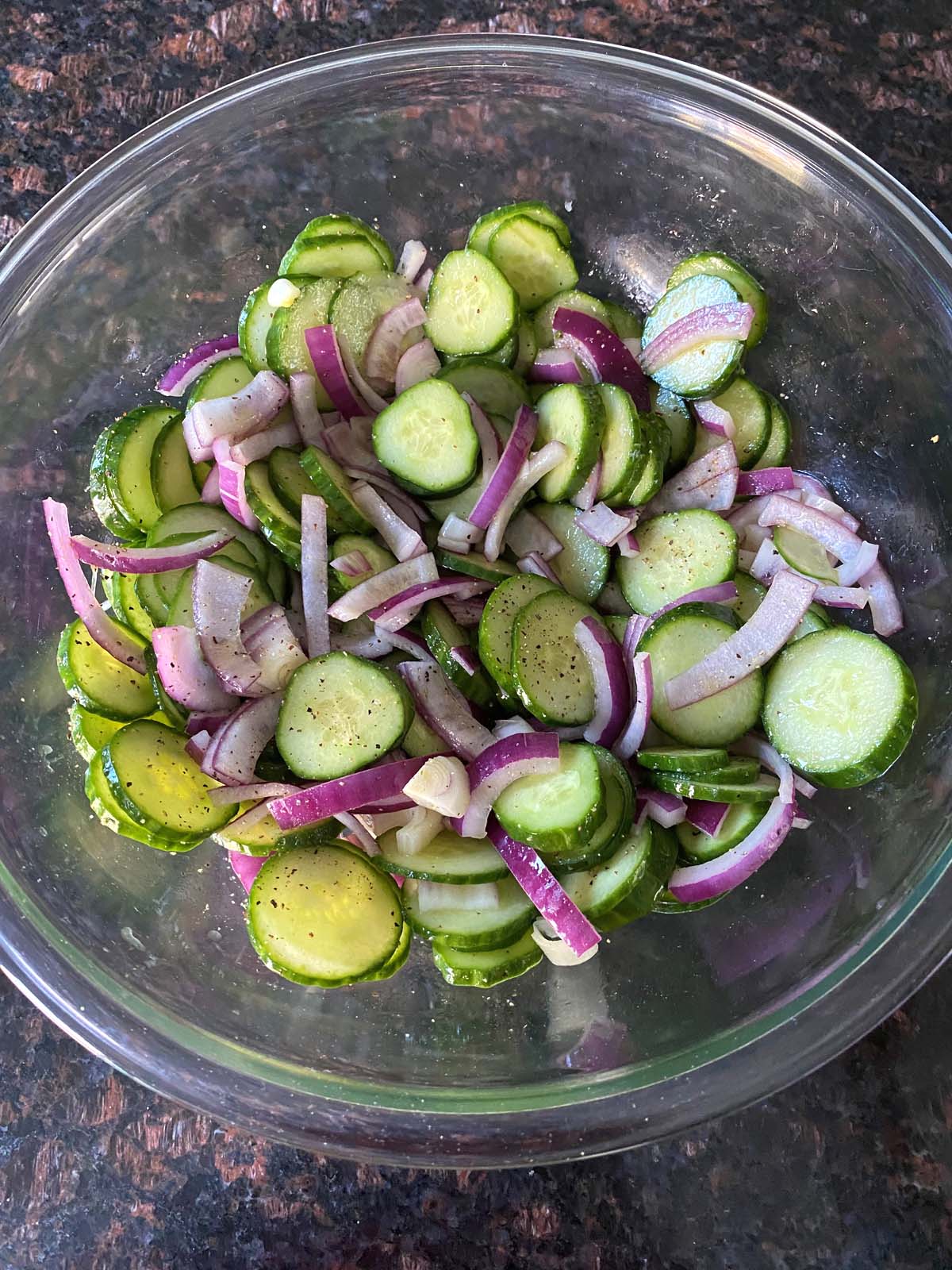 - Pour the dressing over the cucumbers and onion. Then sprinkle everything with some salt and black pepper to taste.