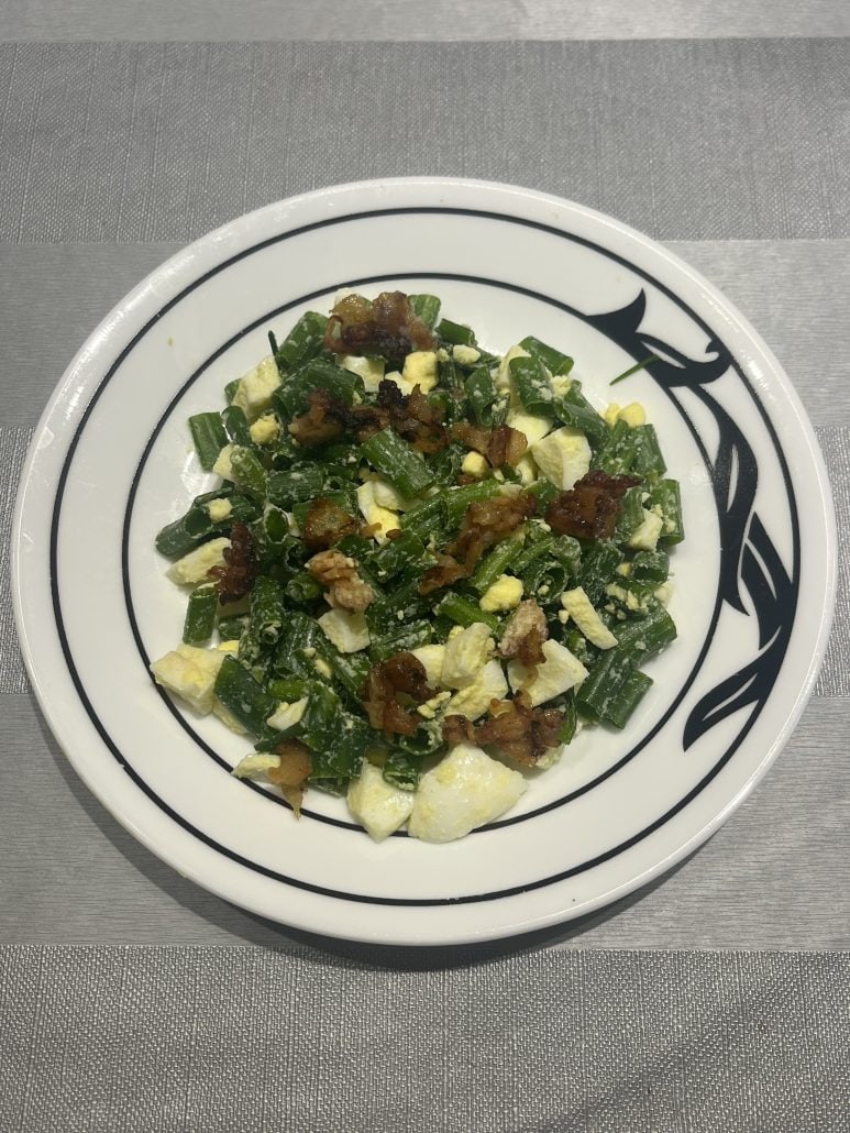 - Immediately pour the hot bacon pieces and bacon grease over the egg and green onion mixture.