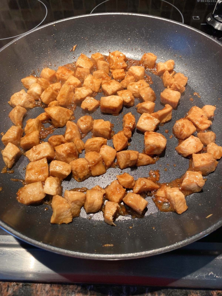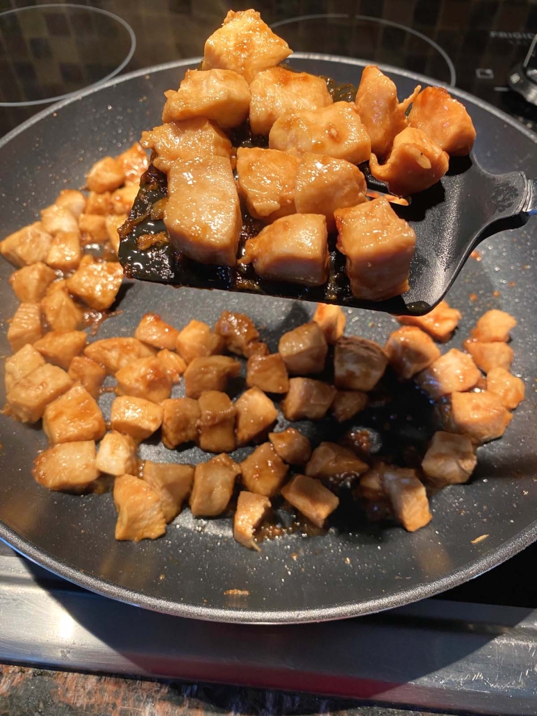 These pan fried chicken bites are yummy in so many meals. You can serve them on their own or add them to salads, pasta, or protein bowls. For an easy weeknight dinner, cook up quick ramen noodles and top them with (warmed) frozen vegetables and this Hibachi chicken. So simple, healthy, and filling!
