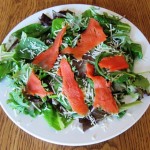 Here’s a great main dish salad that has lettuce greens, Parmesan cheese and smoked salmon. The salad greens are dressed in olive oil and balsamic vinegar, then sprinkled with Parmesan cheese and topped with the smoked salmon!