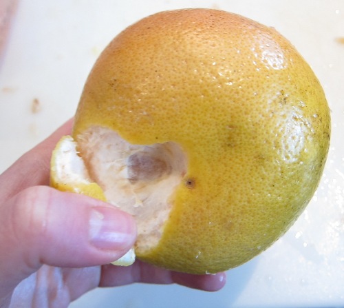 - Start peeling the skin off the grapefruit – begin with the hole that you made in the skin and continue peeling the skin off until there is no more of it left on a grapefruit.
