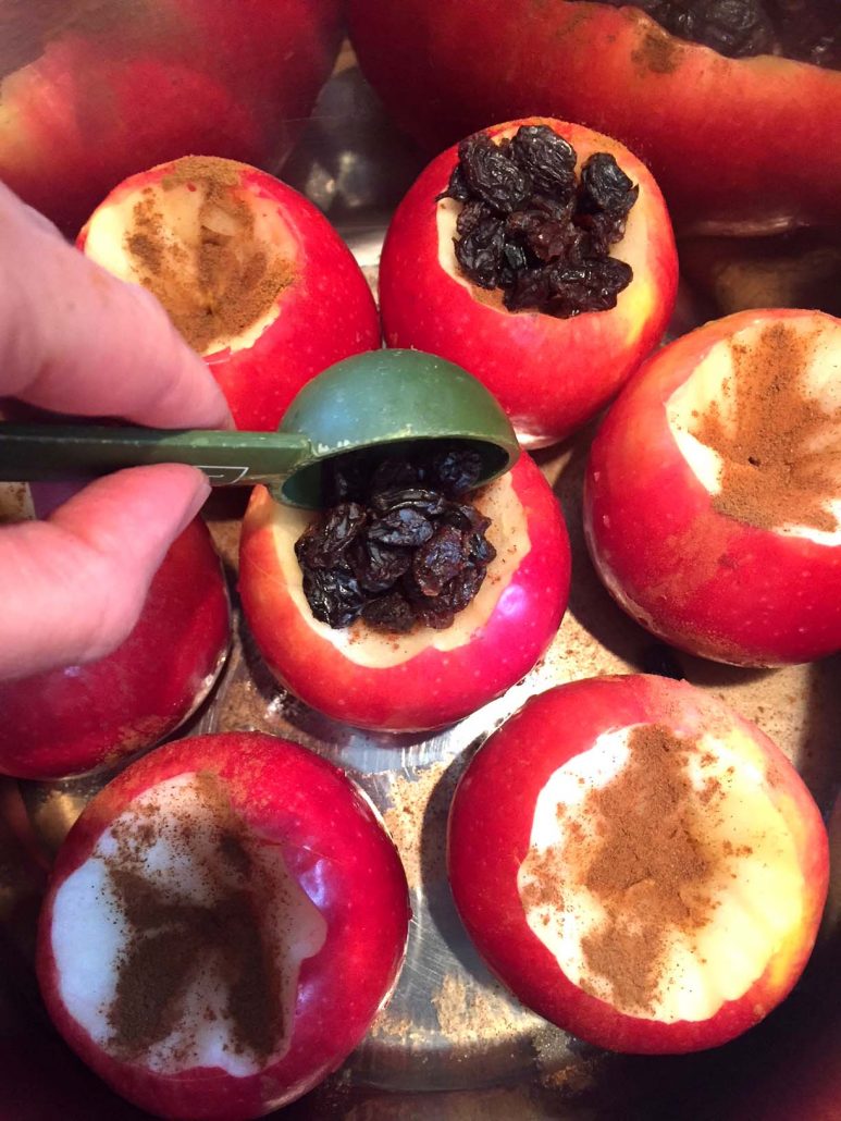 - Cut out holes on top of each apple. Put apples in the Instant Pot in a single layer. Sprinkle the cut out top apple parts with cinnamon and stuff with raisins.