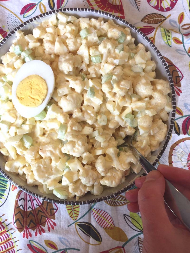 - Put cooked cauliflower in a large bowl and add chopped eggs, onion, celery, mayo, mustard, salt, pepper and paprika (if using). Add more mayo and salt to taste if needed.