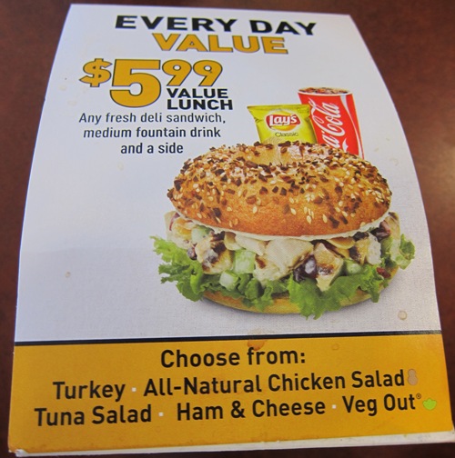 Einstein Bagels has a special lunch value menu. For just $5.99, you get a delicious fresh deli sandwich, side of potato salad or chips and a drink. The sandwich choices are turkey, chicken salad, tuna salad, ham and cheese and veggie.