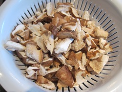 - While the chicken cooks, chop the onion, remove the stems from the shiitake mushrooms, and chop the caps. Peel and chop the zucchini. Mince the garlic.