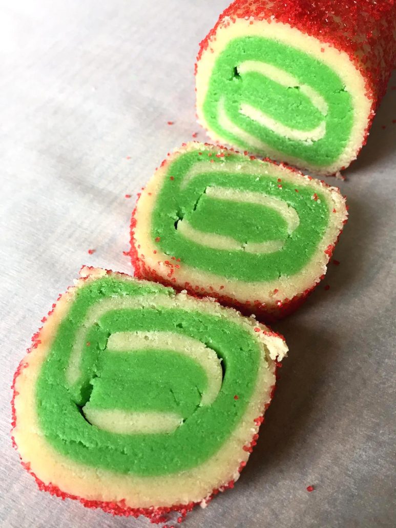 I’m using the Christmas colors of red, white and green for this classic Christmas pinwheel cookie recipe, but feel free to change out the color for other holidays! You can have blue and white for Hanukkah, red and white for Valentine’s day, orange and brown for Halloween – anything goes!