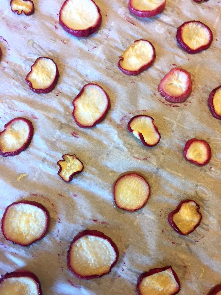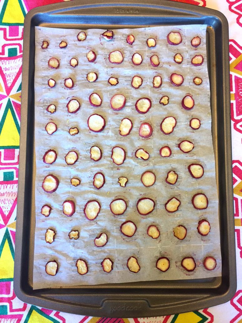 - Slice the radishes as thin as possible (the thinner the slices, the crispier the radish chips will be).