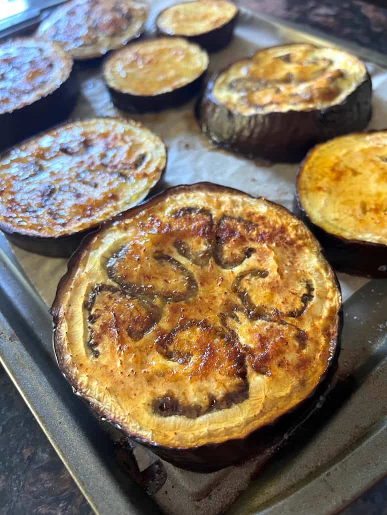 - Don’t skip the oil: Brushing the eggplant slices with olive oil ensures they roast properly and develop a golden-brown caramelized exterior. You don’t need a lot—just enough to lightly coat each slice.