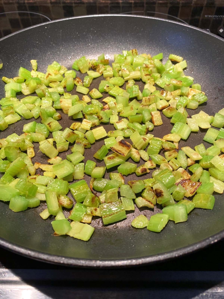 - Drizzle the frying pan with oil and add the celery. Turn the heat to high.