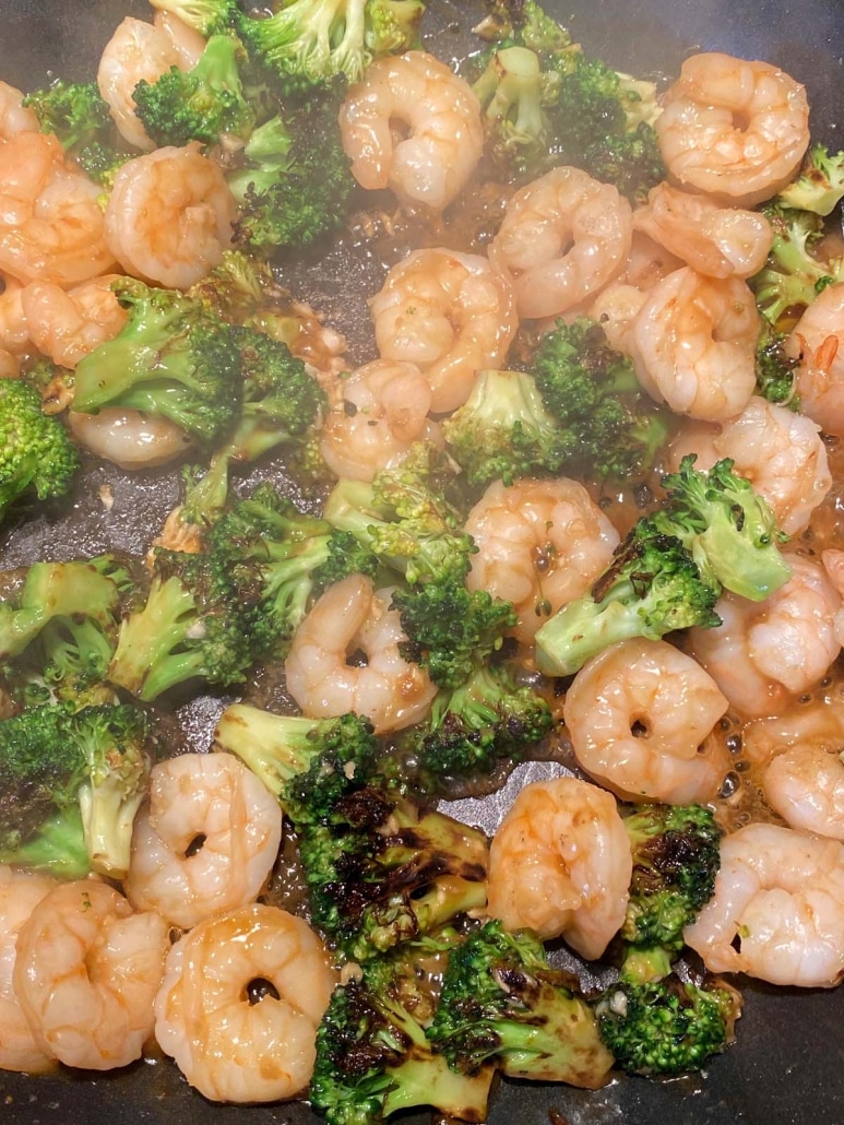 You can use frozen (thawed) cooked shrimp and broccoli or raw ingredients in this recipe. For this version, we are using pre-cooked shrimp and raw broccoli. So we’ll cook the broccoli in the skillet for longer.