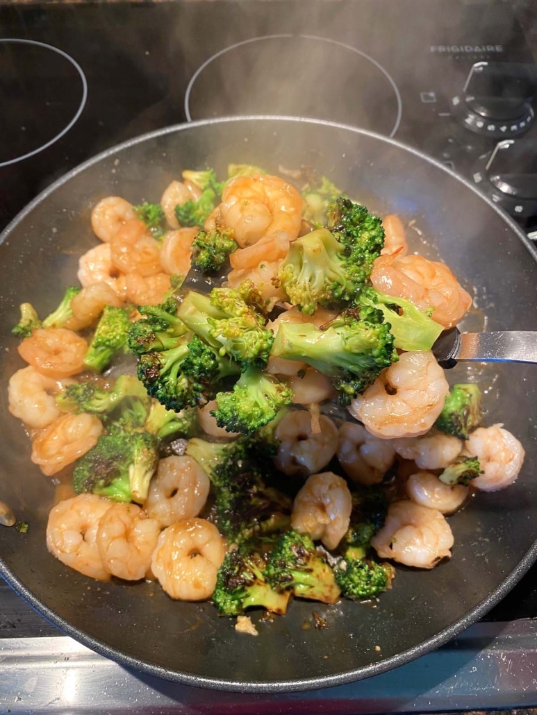 - Move cooked broccoli to plate so you can heat up the shrimp.
