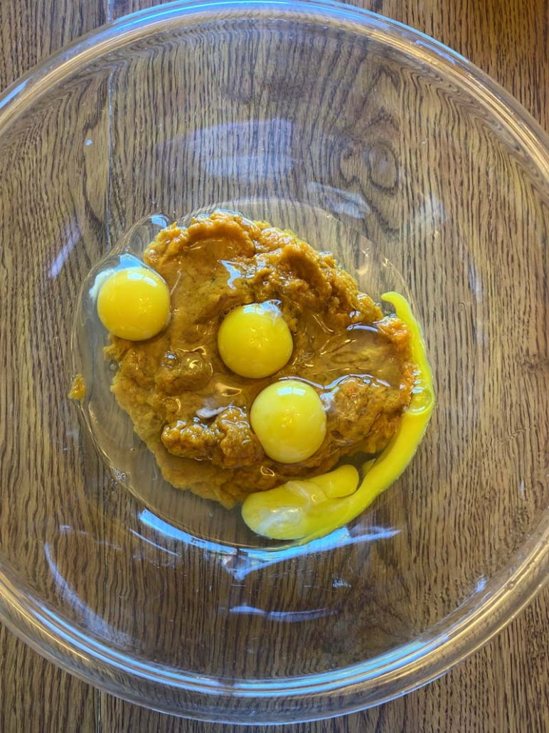 Next, combine the mashed sweet potato, eggs, and cinnamon in a bowl, mixing until smooth. No lumps here!