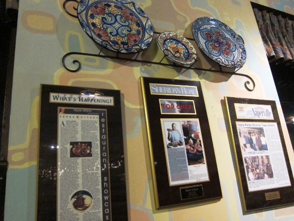 Here’s the photo of the frames articles about Tapas Gitana on the wall, along with cool plates:
