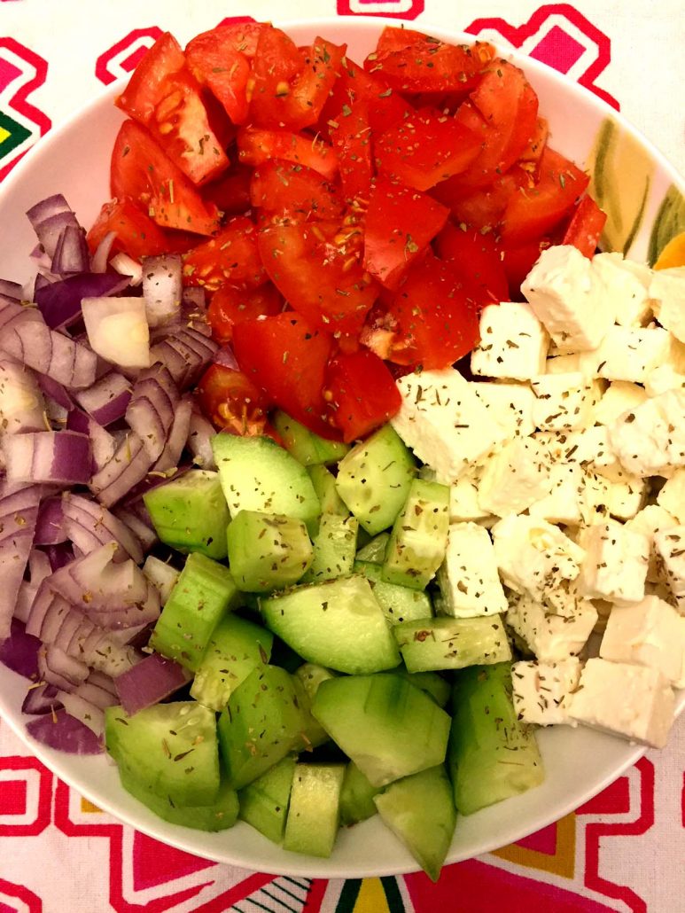Making this Greek salad is really easy – just chop the tomatoes, cucumbers, onions and Feta cheese, sprinkle with salt and pepper and oregano, then dress with a mixture of extra-virgin olive oil and vinegar. That’s it! You can use the vinegar of your choice, whatever flavor you feel like reflecting in your salad. You can use balsamic vinegar, red wine vinegar, apple cider or just plain white – they’ll all work :)